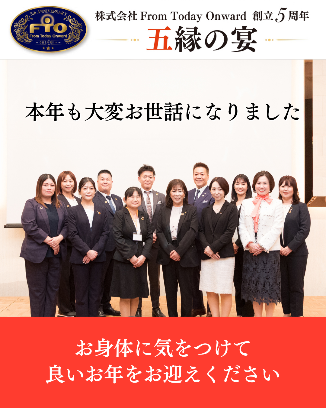 皆さま、こんにちは!本日は、2025年10月10日(金)に福岡市中央区天神にありますソラリア西鉄ホテル福岡で、弊社創立5周年記念式典「五縁の宴」を開催しましたので、ご報告とお礼です。 ご多用中のところ、皆さまにはご臨席い … 弊社 創立5周年記念式典「五縁の宴」を開催!