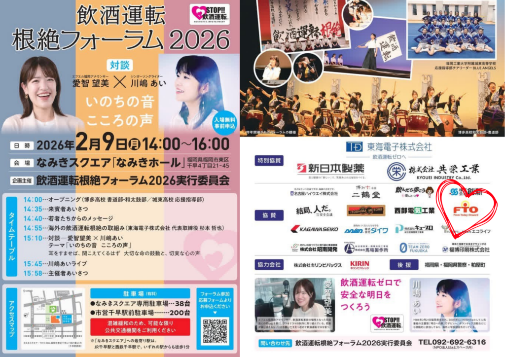 2026年2月9日(月)に福岡市東区千早にあります、なみきスクエア「なみきホール」にて開催された、NPO法人はぁとスペース主催『飲酒運転根絶フォーラム2026』に今年も協賛・参加しましたのでご報告です!